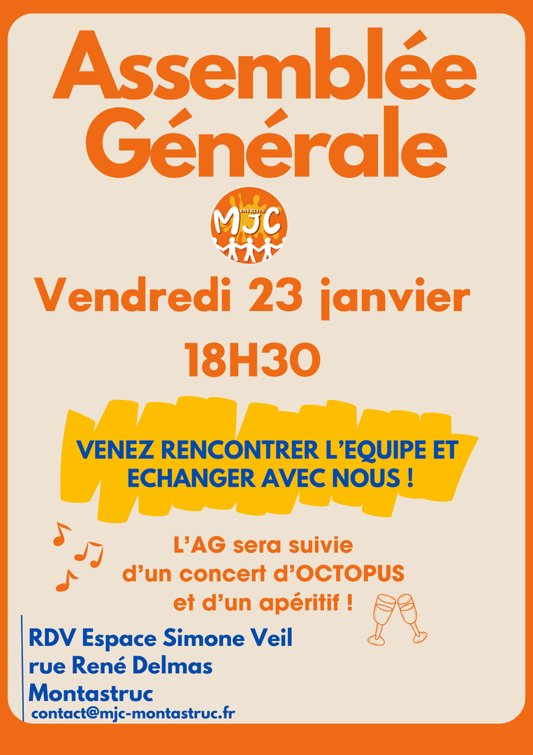 Nous vous donnons RDV vendredi 23 janvier à 18h30, à l’espace Simone Veil, rue René Delmas à Montastruc La Conseillère. L’occasion de faire le point sur l’année écoulée et de se projeter vers les projets à venir. L’AG sera suivie d’un concert d’OCTOPUS, jeunes musiciens de la MJC. En cas d’empêchement, les adhérents absents peuvent se faire représenter par un mandataire de leur choix en utilisant le pouvoir ci-dessous.